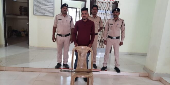 मामले का संक्षिप्त विवरण इस प्रकार है कि प्रार्थी संतराम टण्डन पिता तीजराम टण्डन उम्र 27 साल साकिन नरियरा थाना हसौद दिनांक 16.10.2022 को थाना उपस्थित आकर रिपोर्ट दर्ज कराया कि दिनांक 16.10.2022 के रात्री करीबन 02. 50 बजे मैं अपने घर में था उसी समय त्रिदेव राय अपने दोस्त गब्बर यादव एवं जनाधर सतनामी तीनो ने मेरे घर के पास आकर मुझे मां बहन की गाली दे रहे थे अपने घर के बाहर निकला तो तीनो मुझे एक राय होकर जान से मारने की धमकी देकर हाथ मुक्का से मारपीट करने लगे एवं त्रिदेव राय ने अपने हाथ में लोहे की नंगी तलवार को लहराकर डरा धमकाने लगा तो मै डर में अपने घर में घुस गया प्रार्थी कीरिपोर्ट पर आरोपियों के विरुद्ध धारा 294,506,323.34 भादवि का अपराध पंजीबद्ध कर विवेचना में लिया गया है। श्रीमान पुलिस अधीक्षक एम०आर० अहिरे (भा.पु.से), अतिरिक्त पुलिस अधीक्षक महोदया गायत्री सिंह (रा.पु.से) एवं अनुविभागीय अधिकारी (पुलिस) चन्द्रपुर / डभरा बी. एस. खुटिया को मामले की गंभीरता को देखते हुये प्रकरण के आरोपी को त्वरित गिरफ्तारी करने निर्देश प्राप्त होने पर उनके मार्गदर्शन में आज दिनांक 02.11.2022 को आरोपी त्रिदेव राय पिता राजकुमार राय उम्र 24 साल साकिन नरियरा थाना हसौद को हिरासत में लेकर पूछताछ करने से घटना दिनांक को घटना घटित करना स्वीकार कर घटना में प्रयुक्त 01 नग लोहे की नंगी तलवार को को पेश पर जप्त किया गया एवं आरोपियों के विरुद्ध धारा 25, 27 आर्म्स एक्ट जोडी गयी है। आज दिनांक 02.11.2022 के 12:20 बजे गिरफ्तार कर न्यायालय पेश किया गया है। उक्त मामले की कार्यवाही में उप निरीक्षक नवीन पटेल, सउनि लखपति प्रधान मीरीश साहू, मनोज कोशले, बृजमोहन नेताम, घनश्याम टण्डन, प्रमोद सोनंत ,महेन्द्र महेश्वरी का विशेष योगदान रहा है।
