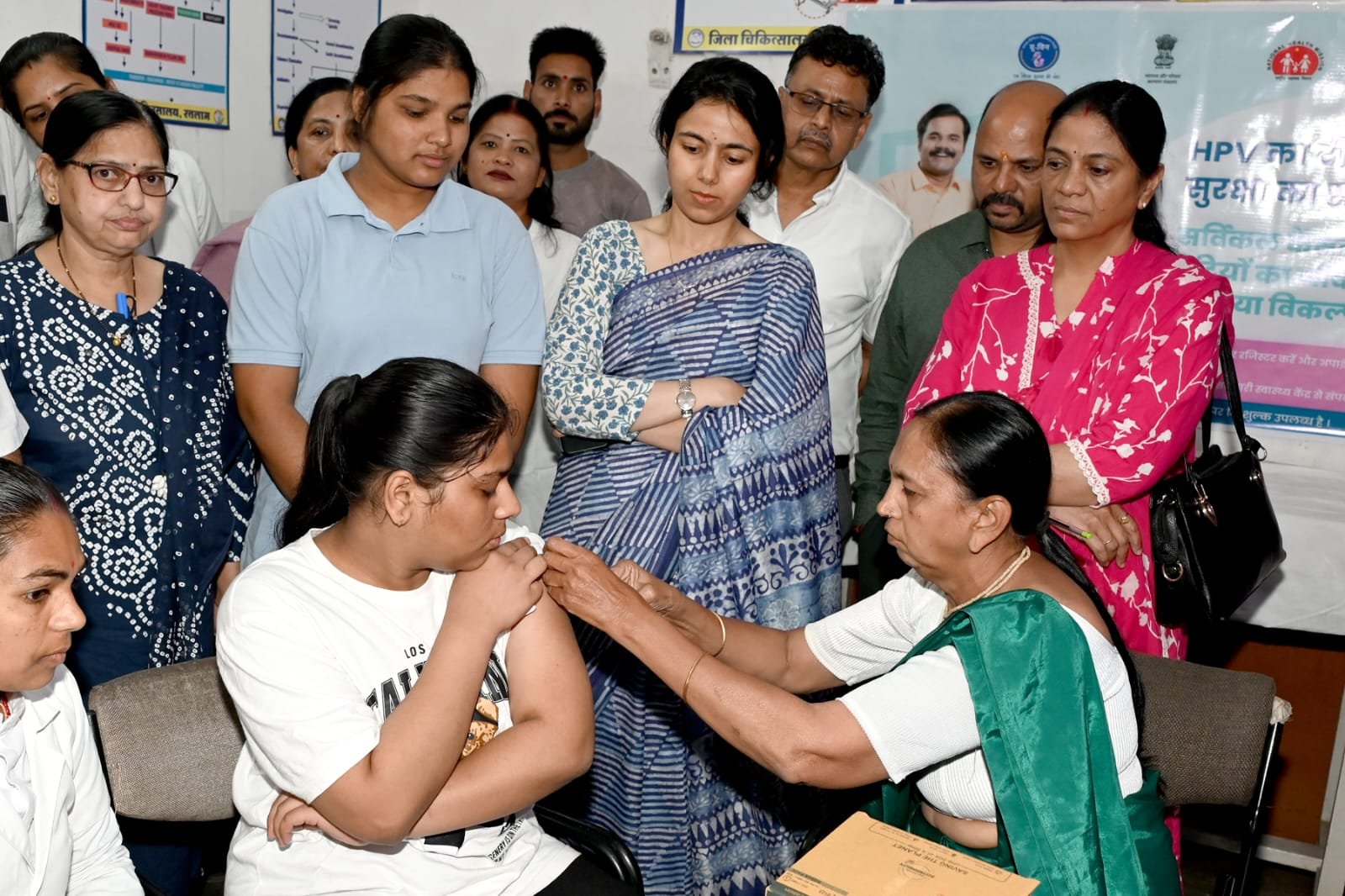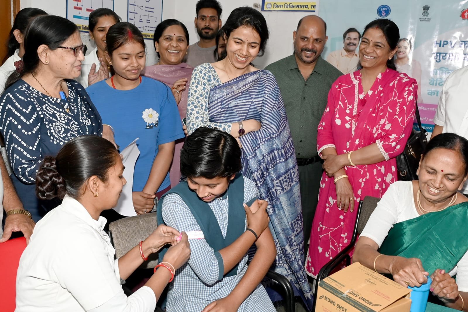 प्रधानमंत्री नरेंद्र मोदी द्वारा सर्वाइकल कैंसर (गर्भाशय ग्रीवा कैंसर) से बचाव के लिए ह्यूमन पैपिलोमा वायरस(एच पी वी ) एचपीवी वैक्सीनेशन अभियान का शुभारंभ अजमेर राजस्थान से किया गया। रतलाम जिले में कलेक्टर मिशा सिंह , रोगी कल्याण समिति सदस्य गोविंद काकानी, हेमंत राहोरी, सीएमएचओ डॉ संध्या बेलसरे, प्रभारी सिविल सर्जन डॉ ए पी सिंह, प्रभारी बाल चिकित्सालय एवं शिशु रोग विशेषज्ञ डॉ आर सी डामोर, शिशु रोग विशेषज्ञ डॉ मनीष सिंह, जिला टीकाकरण अधिकारी डॉ वर्षा कुरील ,डीपीएम अर्चना राठौर एपिडेमियोलॉजिस्ट डॉ गौरव बोरीवाल, डी सी एम कमलेश मुवेल की उपस्थिति में बाल चिकित्सालय रतलाम में 14 से 15 वर्ष की बालिकाओं का (एच पी वी ह्यूमन पैपिलोमा वायरस )वैक्सीनेशन प्रारंभ किया गया।