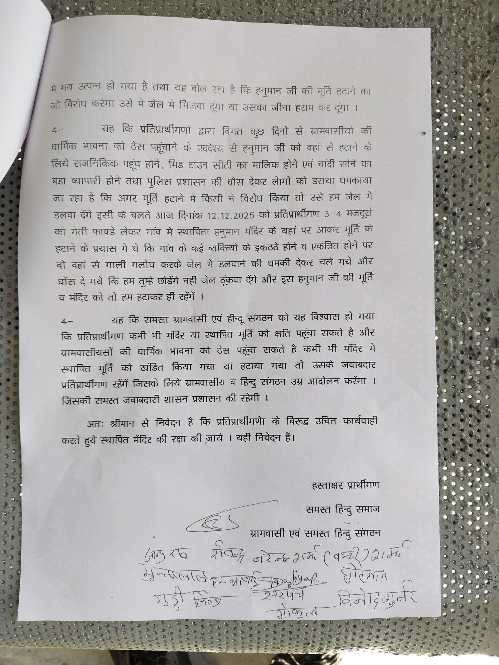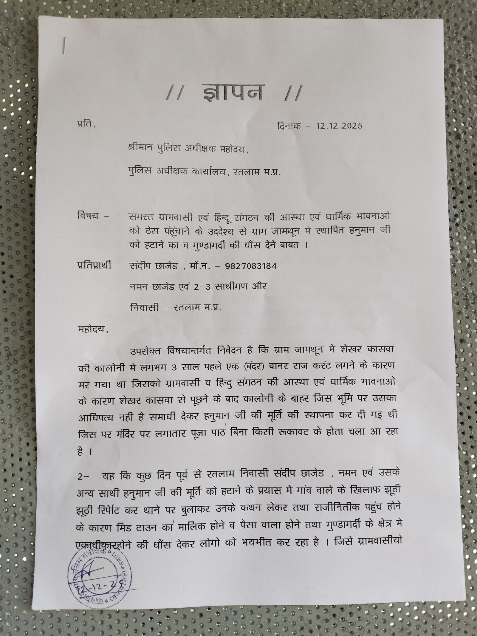 रतलाम जिले के जामथुन गांव में हनुमान मंदिर को लेकर धार्मिक आस्था और गुंडागर्दी का विवाद और गहरा गया है। ग्रामवासियों और हिंदू संगठनों ने पुलिस अधीक्षक को ज्ञापन सौंपा है जिसमें संदीप छाजेड़, नमन छाजेड़ और उनके साथियों पर मूर्ति हटाने की धमकी और धौंसपट्टी का आरोप लगाया गया। सरपंच रवि राज डोडियार ने स्पष्ट शब्दों में कहा 3 साल से मंदिर की पूजा शांतिपूर्ण तरीके से हो रही है। यह हमारी आस्था का प्रतीक है ऐसी गुंडागर्दी बर्दाश्त नहीं की जाएगी। ज्ञापन में चेतावनी दी गई कि यदि मूर्ति को नुकसान पहुंचा तो उग्र आंदोलन होगा और जिम्मेदारी प्रशासन की होगी।