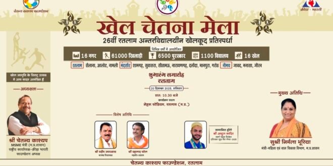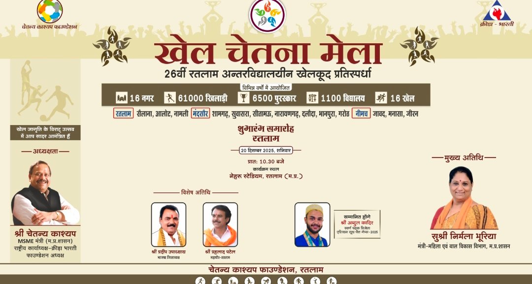 क्रीड़ा भारती एवं चेतन्य काश्यप फाउंडेशन द्वारा आयोजित 26 वीं अंतरविद्यालयीन खेलकूद प्रतिस्पर्धा “खेल चेतना मेला” का शुभारंभ समारोह 20 दिसंबर 2025, शनिवार को प्रातः 10:30 बजे, नेहरू स्टेडियम, रतलाम पर आयोजित होगा।