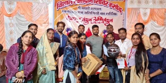 हसौद मानव जीवन को बचाने की दिशा में उत्कृष्ट और अनुकरणीय प्रयास के उद्देश्य से चलाए गए स्वैच्छिक रक्तदान शिविर में लगभग 200 यूनिट ब्लड डोनेट कर रक्तवीरों ने स्वैच्छिक रक्तदान शिविर को सफल बनाया है। उल्लेखनीय है कि मां महामाया की पावन नगरी ग्राम हसौद में 19 जनवरी को बस स्टैंड में द्वितीय वर्ष कैंप लगाकर स्वैच्छिक रक्तदान शिविर का आयोजन किया गया। शिविर सुबह 8 बजे से प्रारंभ हुआ जो शाम 6 बजे तक चला। शिविर में क्षेत्र के युवाओं और युवतिओ ने बढ़ चढ़ कर हिस्सा लिया। शिविर में पंजीकृत लगभग 200 लोगों ने रक्तदान किया। आयोजक समिति ने रक्तदाताओं को प्रशस्ति पत्र और सुरक्षा के दृष्टि को देखते हुए स्टील बार्ड हेलमेट भेंट कर रक्तवीरों को सम्मानित किया स्वैच्छिक रक्तदान शिविर का एक छोटा सा प्रयास 19 जनवरी 2024 शुक्रवार के दिन किया गया। जिसमे ना सिर्फ रक्तदान शिविर आयोजित कर युवाओं को जागरूक कर रक्तदान करवाया गया। बल्कि सभी युवाओं को निशुल्क हेलमेट प्रदान कर उन्हें सुरक्षित गाड़ी चलाने के लिए भी प्रेरित किया गया आयोजन समिति के आमंत्रण पर मुख्य अतिथि के रूप में भीष्म कुमार पटेल नायाब तहसीलदार,हेमबाई मनबोध साहू सरपंच ग्राम पंचायत हसौद, गोपी सिंह ठाकुर जिला उपाध्यक्ष भाजपा,नरसिंह साहू जिला उपाध्यक्ष किसान मोर्चा भाजपा,सुशीला सिन्हा,रितेश साहू मंडल अध्यक्ष हसौद,परमानंद जांगड़े,डॉ गणपत साहू (लाइफ लाइन हॉस्पिटल)परसदा,सूरज टंडन,योगेंद्र साहू,चंद्रशेखर निराला,डॉ अभिषेक कश्यप,आयोजन में शामिल हुए जिन्होंने भगवान धन्वंतरि की तैलचित्र पर दीप प्रज्वलित और श्रीफल तोड़कर ने रक्तदान कार्यक्रम का शुभारंभ किया एवं रक्तदान भी किया गया इस दौरान मुख्य अतिथि ने इस आयोजन में अपनी भूमिका अदा करने वाले आयोजन समिति के पदाधिकारियों समेत सदस्यों का आभार व्यक्त कर अपने संबोधन में कहा कि रक्तदान महादान है और हमें रक्तदान करने में बिल्कुल भी संकोच नही करनी चाहिए।