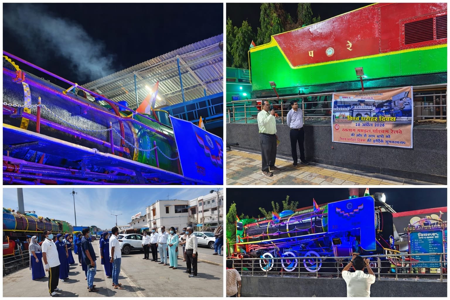 पश्चिम रेलवे रतलाम मंडल द्वारा रतलाम एवं इंदौर रेलवे स्टेशनों पर विश्व धरोहर दिवस (वर्ल्ड हेरिटेज डे) के उपलक्ष्य में विविध कार्यक्रमों का आयोजन किया गया। इस अवसर पर रतलाम एवं इंदौर रेलवे स्टेशन परिसर में स्थित हेरिटेज स्टीम लोको की विशेष साफ-सफाई की गई। साथ ही रतलाम स्थित हेरिटेज स्टीम लोको को तिरंगे रंगों से आकर्षक रूप से सजाया गया, जिसने उपस्थित जनसमूह का विशेष ध्यान आकर्षित किया। जनसंपर्क विभाग द्वारा जारी प्रेस विज्ञप्ति के अनुसार कार्यक्रम के अंतर्गत रतलाम रेलवे स्टेशन पर एक प्रभावशाली फॉगिंग एवं साउंड शो का आयोजन भी किया गया, जिसके माध्यम से दर्शकों को भारतीय रेलवे की समृद्ध विरासत से अवगत कराया गया। इस अवसर पर मंडल यांत्रिक अभियंता सहित यांत्रिक विभाग के पर्यवेक्षक, कर्मचारी एवं बड़ी संख्या में यात्री उपस्थित रहे। कार्यक्रम के दौरान हेरिटेज लोको के ऐतिहासिक महत्व पर प्रकाश डालते हुए रेलवे कर्मचारियों एवं यात्रियों को धरोहर संरक्षण के प्रति जागरूक किया गया।