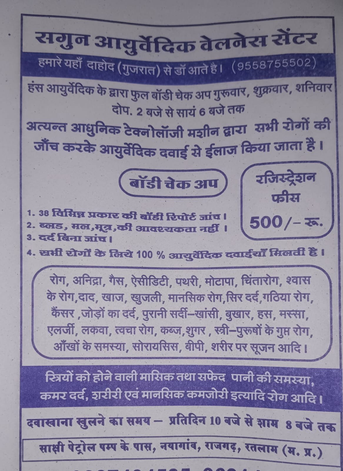 हमारे यहाँ दाहोद (गुजरात) से डॉ आते है। (7024737851) हंस आयुर्वेदिक के द्वारा फुल बॉडी चेक अप गुरुवार, शुक्रवार, शनिवार दोप. 2 बजे से सायं 6 बजे तक, अत्यन्त आधुनिक टेक्नोलॉजी मशीन द्वारा सभी रोगों की जाँच करके आयुर्वेदिक दवाई से ईलाज किया जाता है। बॉडी चेक अप- 38 विभिन्न प्रकार की बॉडी रिपोर्ट जांच । ब्लड, मल, मूत्र, की आवश्यकता नहीं ।