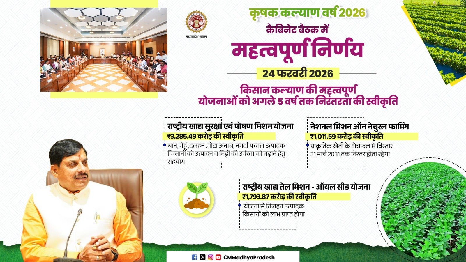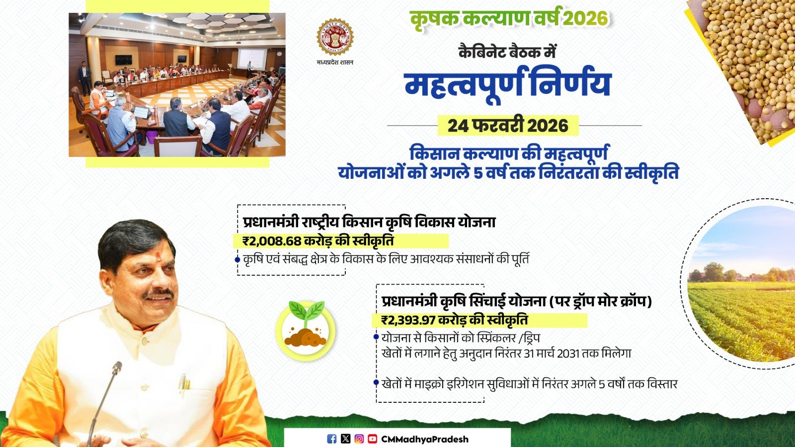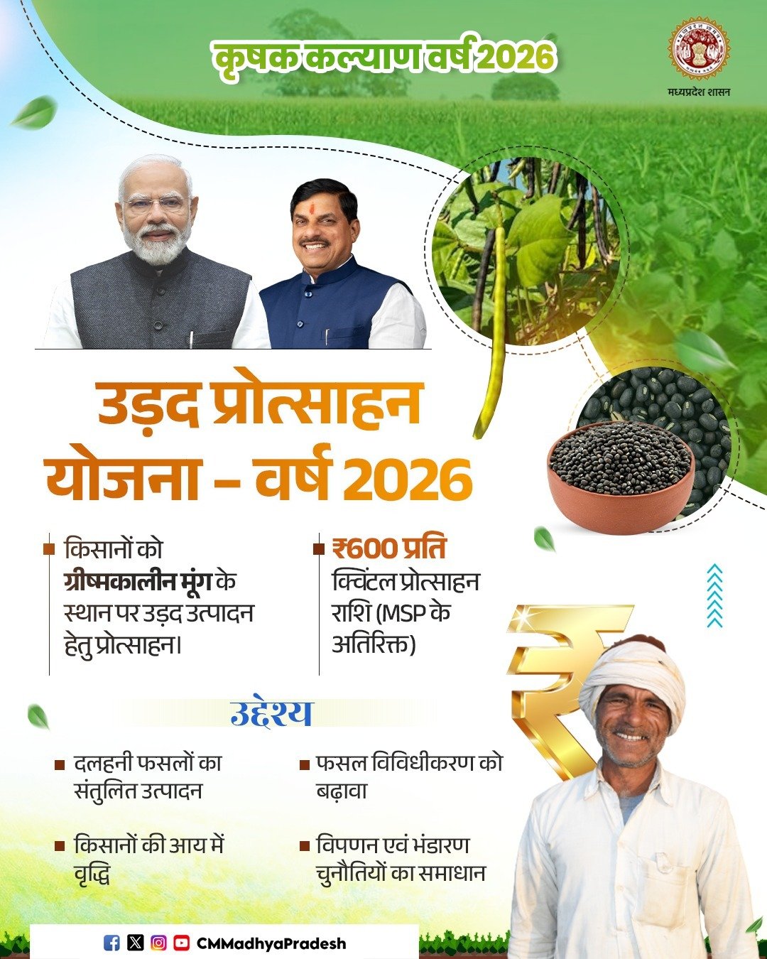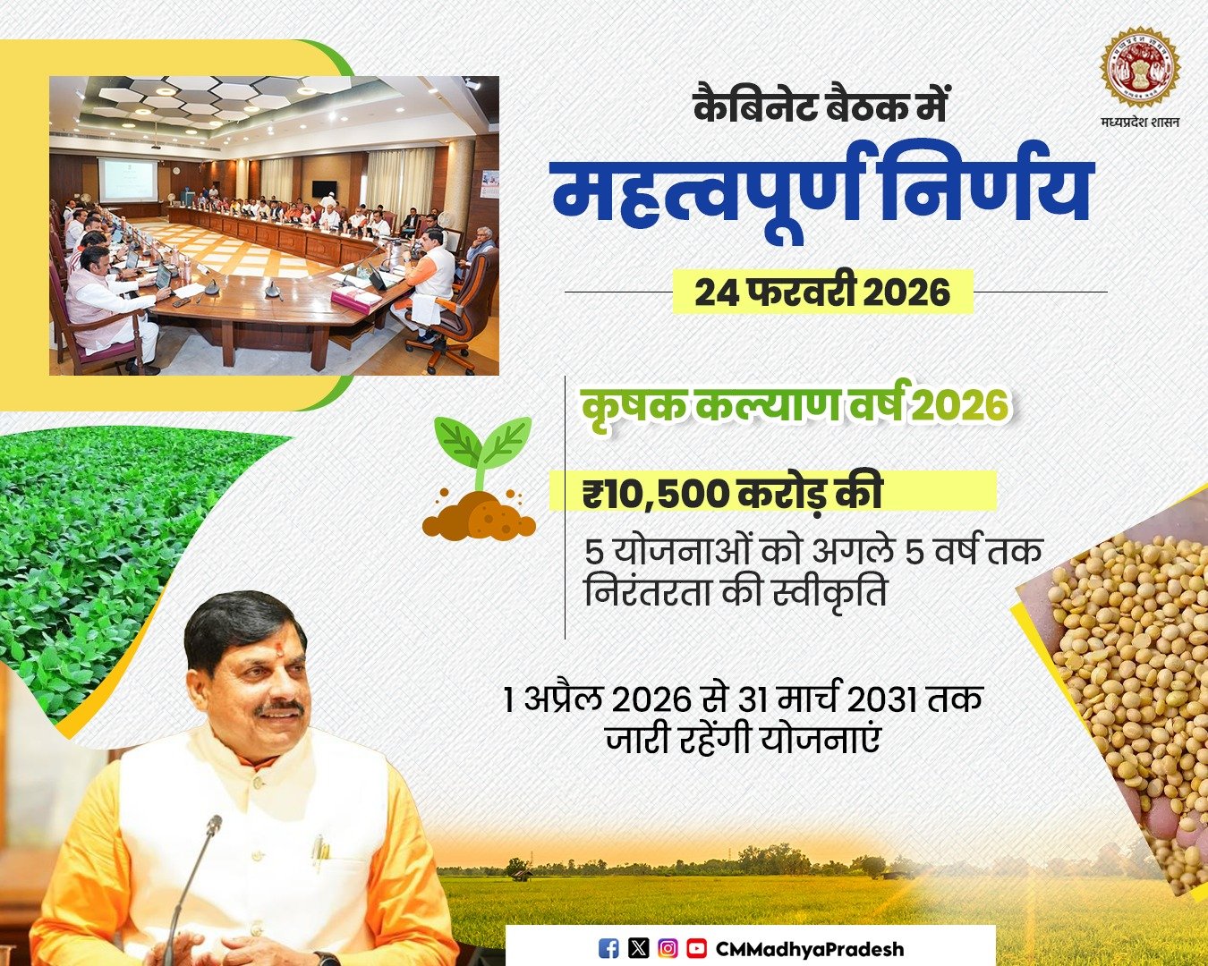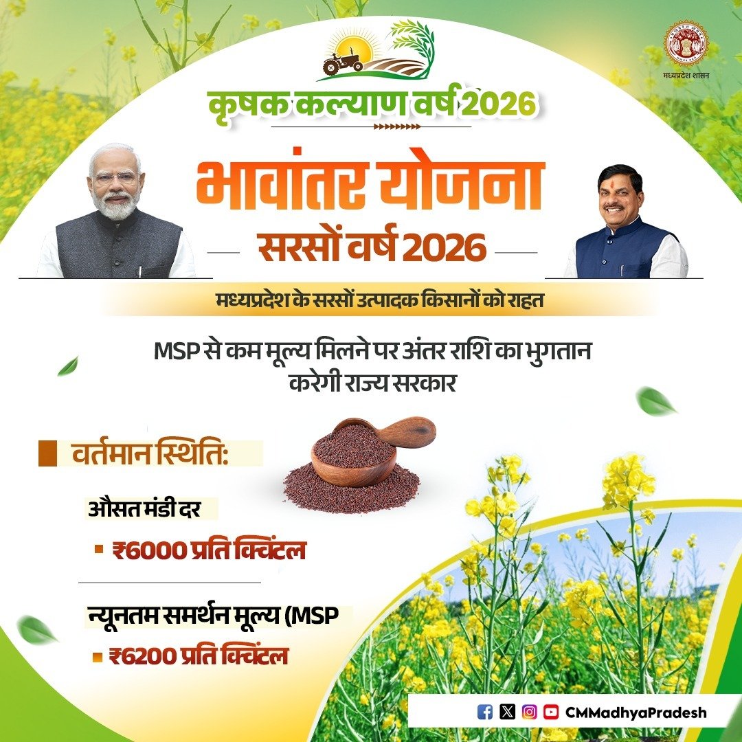 मुख्यमंत्री डॉ. मोहन यादव ने कहा है कि किसान हमारे प्रदेश की अर्थव्यवस्था के आधार स्तंभ हैं। इनके अथक परिश्रम से ही हमारे बाजार गुलजार है। हम वर्ष 2026 को किसान कल्याण वर्ष के रूप में मना रहे हैं। यह वर्ष प्रदेश के इतिहास में किसानों के हित और समग्र कल्याण के मामले में मील का पत्थर साबित होगा।उन्होंने कहा कि यह वर्ष ’खेत से लेकर कारखाने तक और बाग से लेकर बाजार तक’ की पूरी मूल्य संवर्धन श्रृंखला को एक सूत्र में जोड़ेगा। इस वर्ष हम क़ृषि उत्पादों के प्रसंस्करण और इनमें वैल्यू एडिशन के लिए अधिकाधिक रोजगार आधारित उद्योगों के विकास, उन्नत किस्म के बीजोत्पादन, पशुपालन, दुग्धोत्पादन, मत्स्योत्पादन में वृद्धि सहित हर वो कदम उठाएंगे, जिनसे खेती और अन्नदाताओं का विकास हो। मुख्यमंत्री डॉ. यादव ने सोमवार को मुख्यमंत्री निवास से कृषि विश्वविद्यालय परिसर, ग्वालियर में हो रहे ’कृषि मंथन एवं कृषि प्रौद्योगिकी मेला 2026’ को वीडियो कॉन्फ्रेंसिंग से संबोधित कर रहे थे।