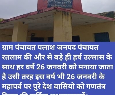 ग्राम पंचायत पलाश जनपद पंचायत रतलाम की और स बड़े ही हर्ष उल्लास के साथ हर वर्ष 26 जनवर को मनाया जाता है उसी तरह इस वर्ष भी 26 जनवरी के महापर्व पर पुरे देश वासियो को गणतंत्र दिवस की हार्दिक शुभकामनायें।