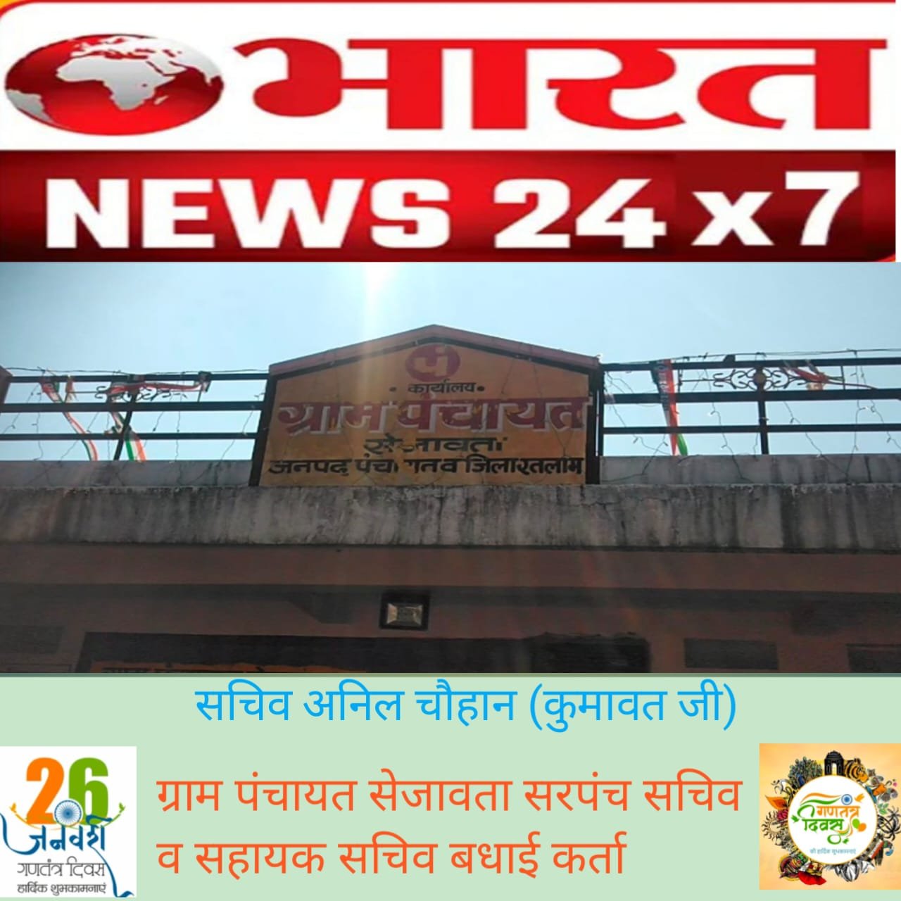 रतलाम ग्राम पंचायत सेजावता व बांगरोद की तरह से पूरे देश व रतलाम जिले की जनता को गणतंत्र दिवस की हार्दिक शुभकामनाएं । बधाई कर्ता - सरपंच सचिव व सहायक सचिव