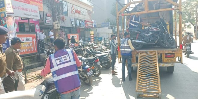 पुलिस अधीक्षक महोदय अमित कुमार (भा.पु.से.) एवं अतिरिक्त पुलिस अधीक्षक महोदय राकेश खाखा (रा.पु.से.) के मार्गदर्शन में उप पुलिस अधीक्षक यातायात अनिल कुमार राय द्वारा हमराह यातायात पुलिस बल का.सउनि.सर्वेश द्वीवेदी, का.सउनि.सुरेन्द्र सिह बौराना, आर. भगत सिह, व क्रेन पार्टी के साथ सयुक्त रुप से सडक सुरक्षा माह-2025 परवाह थीम के तहत दो बत्ती चौराहा से न्यू रोड, लोकेन्द्र टाँकिज चौराहा तक नो पार्किंग मे लगे वाहनो पर चालानी कार्यवाही की गई अव्यवस्थित रुप से “नो पार्किंग” मे लगे वाहनों को क्रेन से टोईंग कर सुरक्षीत थाने पर खडा किया गया व सब्जी फ्रुट के हाथ ठैलागाडी , फुटपाथ पर सब्जी बेचने वालो व दुकानो के बाहर फुटपाथ पर रखे सामान को समझाईस देकर हटवाया जाकर दो बत्ती से लोकेन्द्र टाँकिज तक के मार्ग को यातायात के लिए सुगम व सूचारु किया गया । यह अभियान रतलाम शहर में यातायात को सुगम, सुरक्षित व सूचारु बनाने के लिए लगातार जारी रहेगा । यातायात को सुगम, सुरक्षित व सूचारु बनाने के लिए यातायात पुलिस रतलाम का सहयोग करे । आमजन तक सडक दुर्घटनाओ में कमी लाने एवं यातायात नियमों का शत-प्रतिशत पालन करने सम्बंधी जानकारी दी गई।
