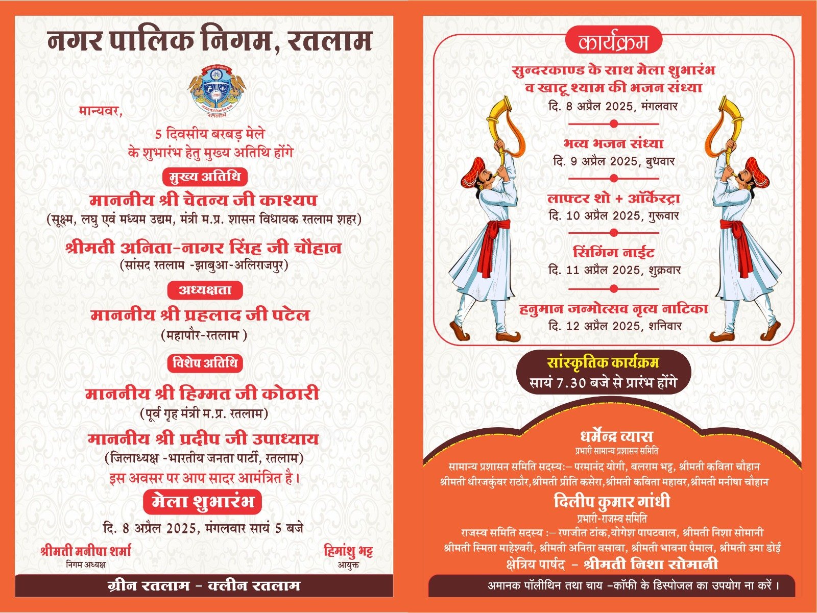 महापौर माननीय प्रहलाद पटेल, निगम अध्यक्ष मनीषा शर्मा, निगम आयुक्त हिमांशु भट्ट, नेता पक्ष भगतसिंह भदौरिया, सामान्य प्रशासन समिति प्रभारी धर्मेन्द्र व्यास, राजस्व समिति प्रभारी दिलीप कुमार गांधी, महापौर परिषद सदस्य पप्पू पुरोहित, श्रीमती अनिता कटारा, अक्षय संघवी, विशाल शर्मा, मनोहरलाल राजू सोनी, रामू भाई डाबी, श्रीमती सपना त्रिपाठी, क्षेत्रिय पार्षद श्रीमती निशा-पवन सोमानी, सामान्य प्रशासन समिति सदस्य परमानन्द योगी पंडित, बलराम भट्ट, श्रीमती कविता चौहान, श्रीमती धीरजकुवंर-किशोरसिंह राठौर, प्रीति-संजय कसेरा, श्रीमती कविता-सुनील महावर, श्रीमती मनीषा-विजयसिंह चौहान, राजस्व समिति सदस्य रणजीत टांक, योगेश पापटवाल, श्रीमती निशा-पवन सोमानी, श्रीमती स्मिता-राजेश माहेश्वरी, श्रीमती अनिता-वसावा, भावना-हितेश पैमाल, उमा-रामचन्द्र डोई एवं समस्त पार्षदगणों ने नागरिकों से अपील की है कि मेला शुभारंभ एवं बरबड़ मेले मे प्रतिदिन रात्रि में निगम रंगमंच पर आयोजित होने वाले सांस्कृतिक कार्यक्रमों में अधिकाधिक की संख्या में उपस्थित रहकर आयोजित कार्यक्रमों को सफल बनावें।