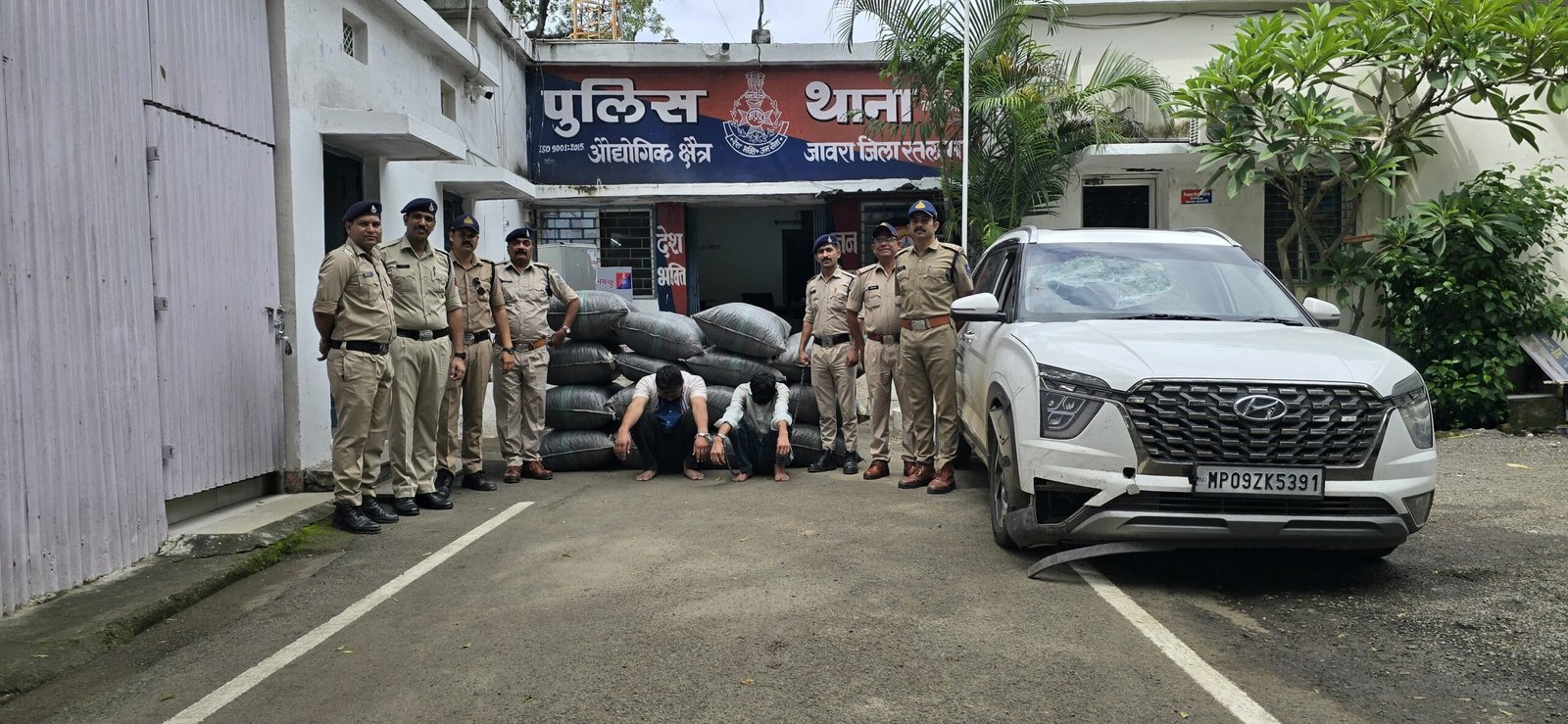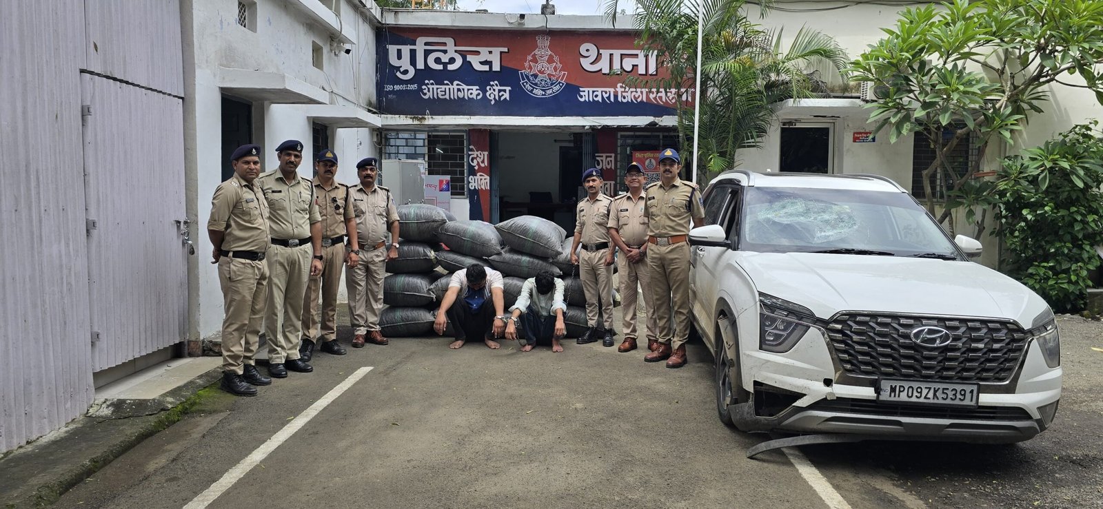 गठित टीम ने मुखबिर सूचना पर होटल प्रेसिडेन्ट के सामने महू नीमच फोरलेन रोड जावरा पर नाकाबंदी कर सफेद रंग की हुण्डई कम्पनी की अल्काजार कार क्रमांक एमपी 09 जेडके 5391 रोककर तलाशी लेते कार मे 15 प्लास्टिक के बोरों में भरे अवैध मादक पदार्थ डोडाचूरा कुल मात्रा 292 किलो 160 ग्राम कीमती 02 लाख 92 हजार रूपये के एवं दो फर्जी नम्बर प्लेट GJ 01 WD 0502 मिली जो आरोपी राकेश कुमार पिता भगवाना खावा जाति विश्नोई उम्र 26 साल निवासी जांबा थाना जांबा जिला फलौदी राजस्थान, आरोपी बजरंग पिता भोमाराम जांगू जाति विश्नोई उम्र 19 साल निवासी कल्याणीनगर थाना चामू तहसील बालेसर जिला जोधपुर राजस्थान के कब्जे से विधिवत जप्त कर आरोपीयो की गिरफ्तारी की गई है तथा थाना औ.क्षैत्र.जावरा पर अपराध क्रमांक 526/30.09.2025 धारा 8/15 एन,डी.पी.एस एक्ट का पंजीबद्ध कर विवेचना मे लिया गया । विवेचना के दौरान उक्त जप्तशुदा हुण्डाई अल्काजार कार दिसम्बर 2024 मे थाना पिपलानी जिला भोपाल से चोरी करना स्वीकार किया है। जो मामले मे बी.एन. एस. की धारा 303 (2) (चोरी करना), 238 (साक्ष्य मिटाना), 341(1) (फर्जी नम्बर प्लेट लगाना) की वृध्दि की गई है। गिरफ्तारशुदा आरोपीयो का पीआर लेकर अवैध मादक पदार्थ के स्त्रोत एवं अन्य आरोपियों के सम्बन्ध मे पूछताछ की जा रही है ।