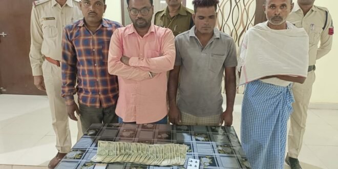पुलिस अधीक्षक एम०आर० अहीरे (भा.पु.से). अतिरिक्त पुलिस अधीक्षक गायत्री सिंह (रा पु से) एवं अनुविभागीय अधिकारी (पुलिस) चन्द्रपुर / डमरा बी एस खुटिया सर के द्वारा थाना क्षेत्र में अवैध जुआ सट्टा पर कार्यवाही करने हेतु निर्देश दिया गया था उनके मार्गदर्शन में आज दिनांक 16.11.2022 को मुखबीर सूचना पर ग्राम गिरौनी सर्वजनिक स्थल पर जुआडियान 1 बलराम टण्डन पिता तीजराम टण्डन उम्र 32 साल साकिन नरियरा 2 मुनेश्वर सुटे पिता गदलाराम खुटे उम्र 32 साल साकिन बरदुली थाना जैजैपुर 3 सीताराम खुटे पिता जनीराम खुटे उम्र 33 साल साकिन मिरौनी थाना हसौद 4 जनीराम खुटे पिता नेगीराम खुटे उम्र 55 साल साकिन मिरौनी थाना हसीद जिला सक्ती के द्वारा तास के 52 पत्ती से रूपये पैसो का दाव लगाकर जुआ खेल रहे थे उक्त जुआडियान के कब्जे से जुआ नगदी रकम 10100रू एवं 52 पत्ती तास को जप्त कर 13 जुआ एक्ट की कार्यवाही कर आरोपीयो को गिरफ्तार किया गया। उक्त की कार्यवाही में उप निरीक्षक नवीन पटेल प्र०आर० पुरनलाल कैवर्त, आर0 मीरीश साहू, बृजमोहन नेताम, मनोज कोशले, अरूण चन्द्रा का विशेष योगदान रहा है।